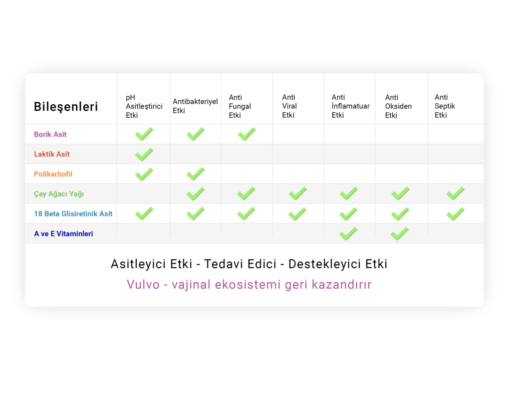 Tabloda da görüldüğü üzere Lattawin ovül, pH üzerine asitleştirici etkisini, borik asit, laktik asit, polikarbofil ve 18 beta glisiretinik asit sağlarken bunu yanı sıra Lattawin ovül bileşenlerinin tedavi edici ve antioksidan, antiinfamatuar etkileri ile A ve E vitaminlerinin de desteği söz konusu olup, etkin ve güvenli kullanıma sahiptir.